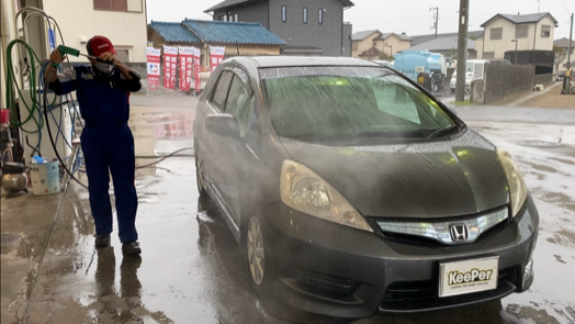 ![]() まずは、ほこりやある程度の汚れを高圧ガンにて飛ばしていきます。 上部から下へと汚れを落としていく感じです。 施工はキーパー技能検定1級の渕上さんです。