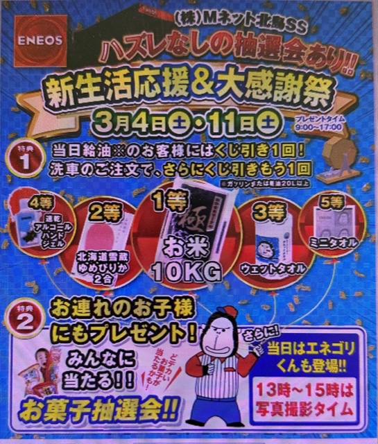 Mネット北島ではお客様大感謝祭を3月4・11に行います。 当日はエネゴリ君も登場する予定です。 宜しければ皆様お越しください。 お待ちしております。 ![]() |